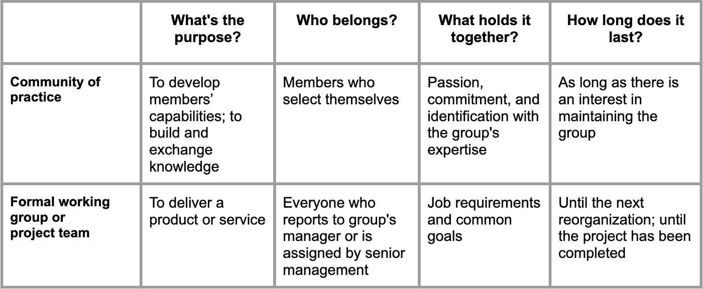 In the end, we get that communities of practice are primarily about knowledge. About the form of its transmission. A fair question is, “What about courses, lessons, mentoring, and so on?” Each has their advantages and disadvantages.